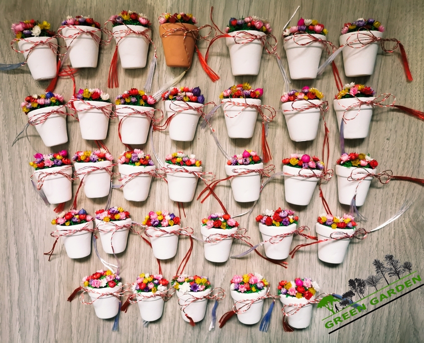 Mini jumatati de ghiveci realizate din praf ceramic, decorate cu licheni stabilizati, flori uscate si stabilizate.