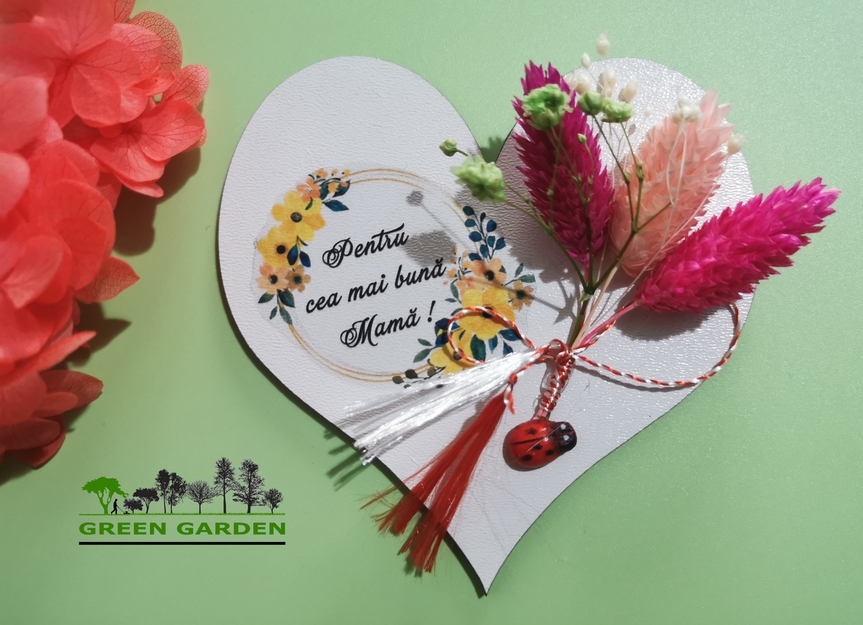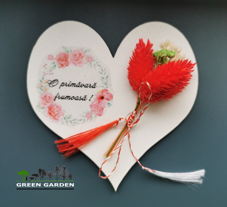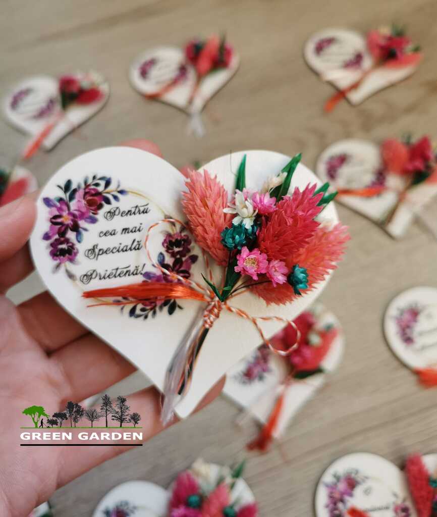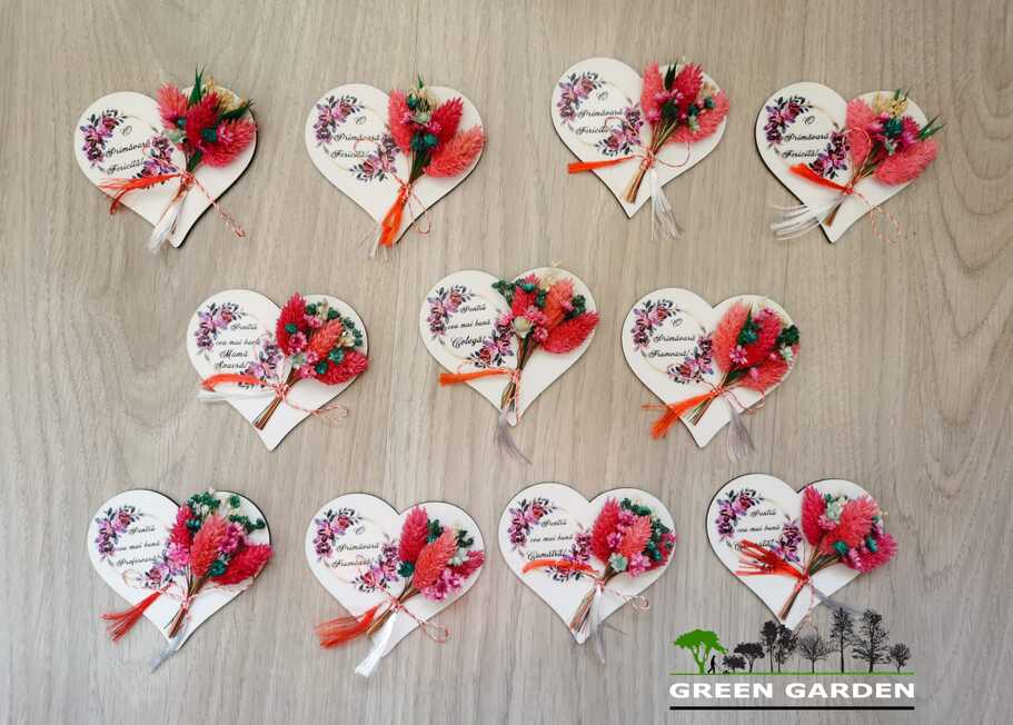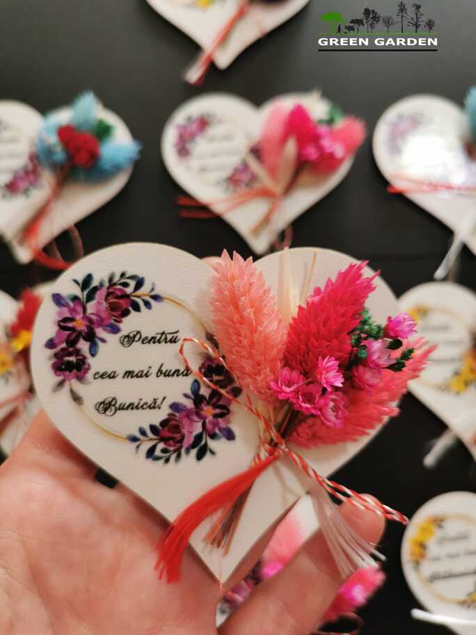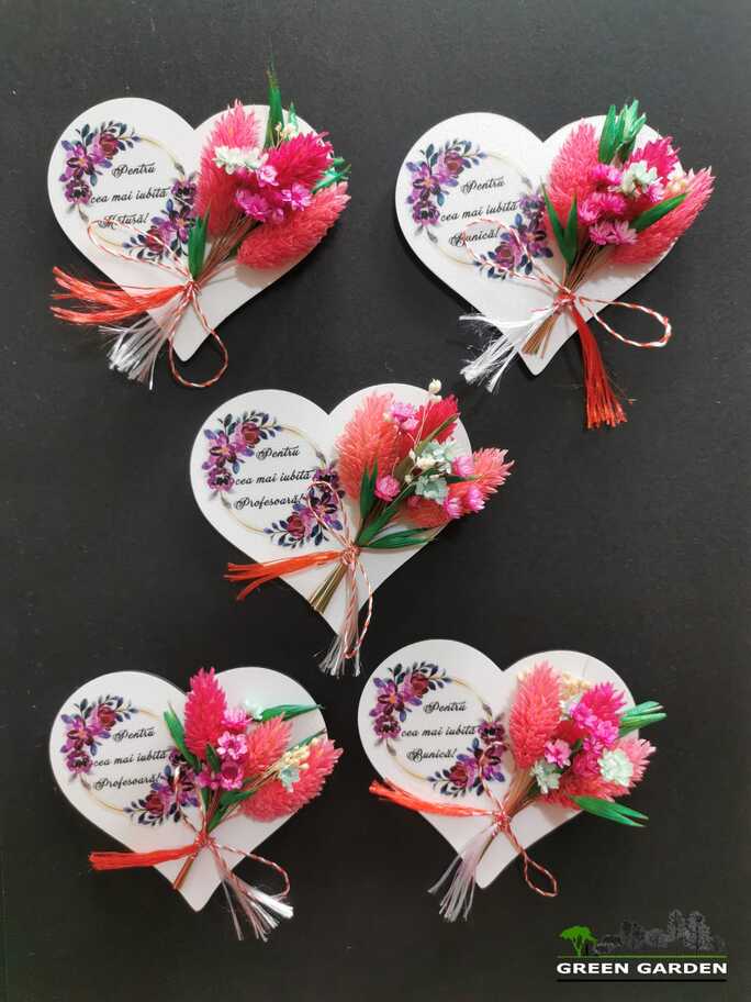 Inima masoara 8.5 cm si este infrumusetata de un buchet format din plante uscate si stabilizate. Martisoarele vin ambalate in cutii individuale cu fereastra.